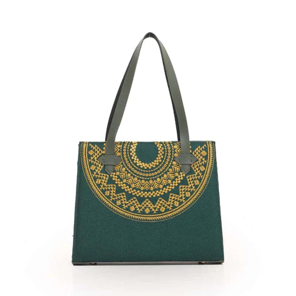 This is a stylish handbag featuring a deep green canvas body adorned with intricate golden embroidery in a geometric and circular pattern, giving it a sophisticated and ethnic touch. It has dual shoulder straps in a contrasting olive green leather, adding durability and an elegant design contrast. The structured shape and spacious interior make it both functional and fashionable, perfect for everyday use or special occasions.